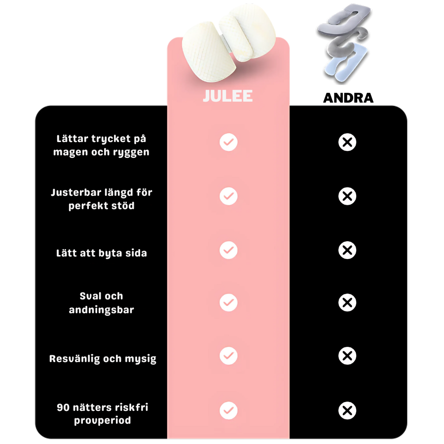 “Jag kan äntligen sova hela natten utan ryggsmärta. Julee Gravidkudde är en livräddare!”